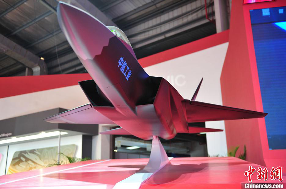 11月13日上午,第九屆中國國際航空航天博覽會在廣東珠海開幕,一架中國先進戰斗機概念模型在中航工業展臺亮相,從外形上看,與前不久成功試飛的殲31相似,備受關注。中新社發 柯小軍 攝
