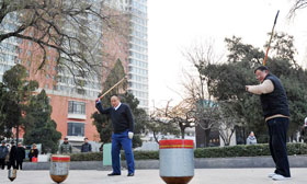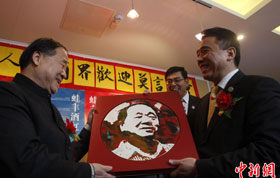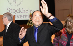 12月9日,在瑞典首都斯德哥爾摩,2012年諾貝爾文學獎得主、中國作家莫言(前左)與夫人杜勤蘭(前右)在當地華人華僑舉辦的歡迎宴會前與眾人一起包餃子。新華社記者武巍攝