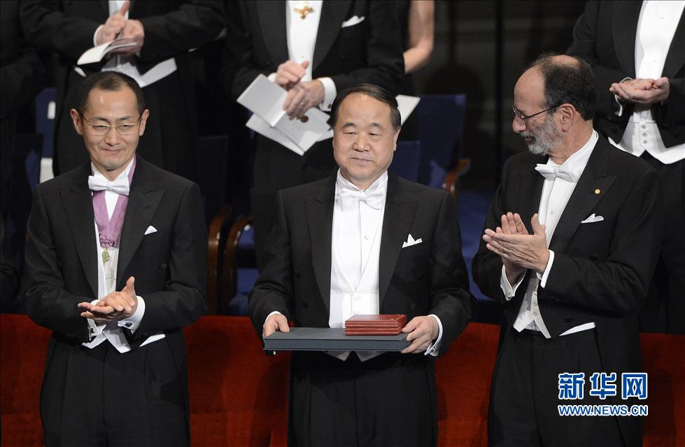 12月10日,在瑞典首都斯德哥爾摩音樂(lè)廳舉行的2012年諾貝爾獎(jiǎng)?lì)C獎(jiǎng)儀式上,中國(guó)作家莫言(前)領(lǐng)取諾貝爾文學(xué)獎(jiǎng)。 新華社記者武巍攝