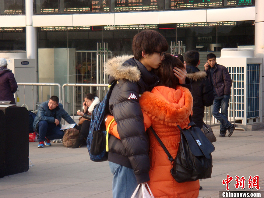 1月22日,重慶火車站迎來(lái)熙熙攘攘的人流,人們行色匆匆地踏上旅途,準(zhǔn)備回家過(guò)年。而隨著重慶高校寒假的到來(lái),外地學(xué)子也將踏上歸途,學(xué)生情侶在車站凝望、話別、擁抱,依依惜別。圖為車站廣場(chǎng)上,一對(duì)學(xué)生情侶擁抱惜別。白永茂 攝