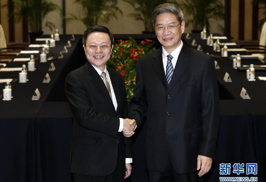 2月11日,國臺辦主任張志軍在南京與臺灣方面大陸委員會負責人王郁琦舉行雙方兩岸事務主管部門負責人首次正式會面。這是兩部門間建立常態化聯系溝通機制的開端。圖為張志軍(右)與王郁琦在舉行正式會面前握手。新華社記者 沈伯韓 攝