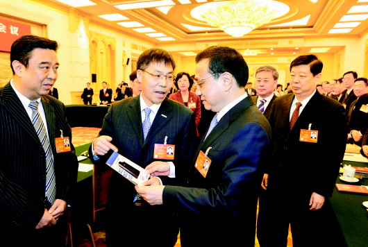 李克強看了孫丕恕代表帶來的由浪潮集團研發的關鍵應用主機的照片,鼓勵他們繼續努力,爭創一流,為國家信息安全做貢獻!跤浾摺》抠t剛 報道