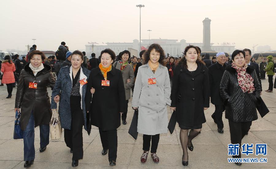 3月8日,全國政協十二屆二次會議在北京人民大會堂舉行第三次全體會議。這是全國政協委員們抵達天安門廣場。新華社記者 張玉薇攝