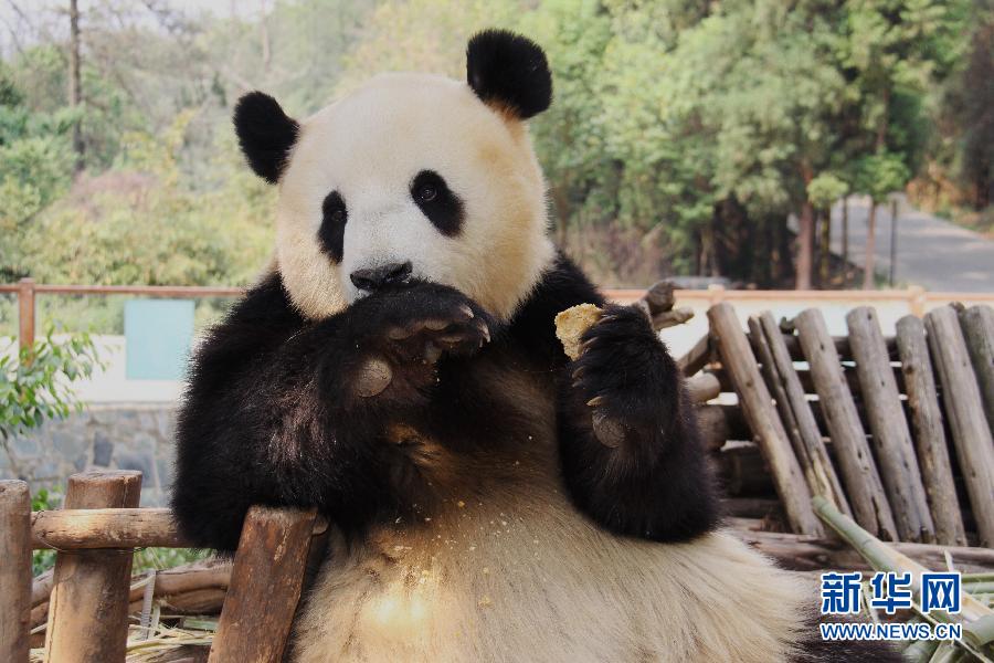 4月26日,大熊貓思嘉坐在棲架上吃窩頭。為此動物園通過讓思嘉看電視、蕩秋千等辦法,讓思嘉漸漸恢復快樂本色,體重也有所增加。云南野生動物園的大熊貓思嘉是汶川地震后,由臥龍中國保護大熊貓研究中心送到云南寄養的3只大熊貓之一。