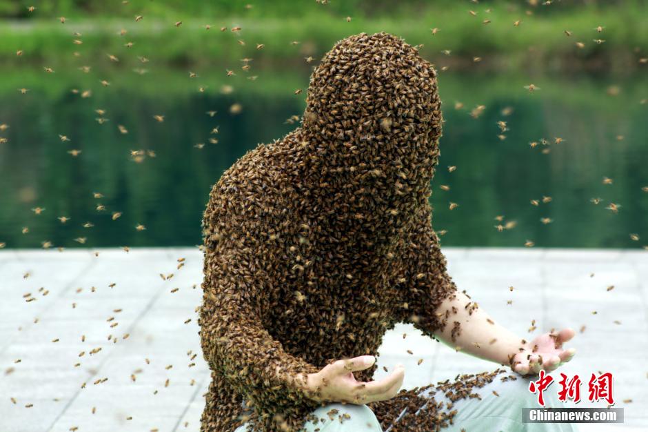 5月13日,“吉尼斯中國之夜”在江西宜春明月山明月廣場舉行。江西“第一蜂人”、宜春市奉新縣養蜂人阮良明挑戰“人體肩部以上布滿蜜蜂堅持時間最長”吉尼斯世界紀錄。最終,吉尼斯認證官宣布,阮良明的人體肩部以上布滿蜜蜂堅持時間為53分34秒,成功創造了吉尼斯世界紀錄。圖為江西“第一蜂人”阮良明靜坐挑戰,上身已布滿密密麻麻的蜜蜂。鄒海斌 攝