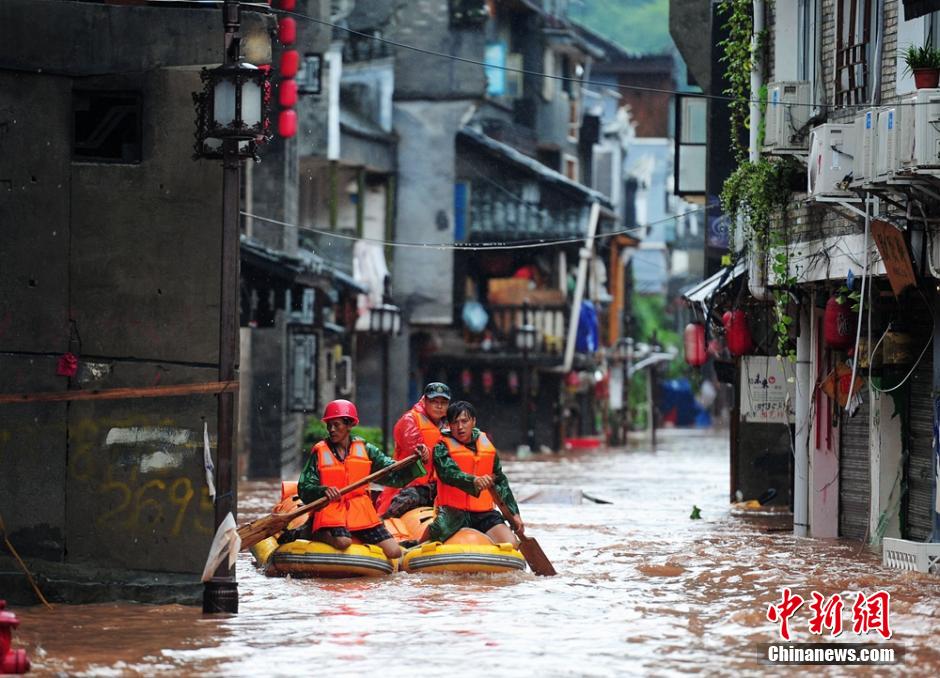 7月16日上午,鳳凰古城大雨持續,但古城內局地洪水已逐漸消退,救援人員開始打掃退去洪水的街道上留下的淤泥和雜物,部分商戶也開門清理店面。14日至15日,鳳凰遭遇特大暴雨襲擊。由于降雨量大、時間持續長、范圍廣、雨勢急,引發大規模洪澇災害,給全縣工農業生產和人民群眾的生命財產,造成嚴重威脅和損失。楊華峰 攝