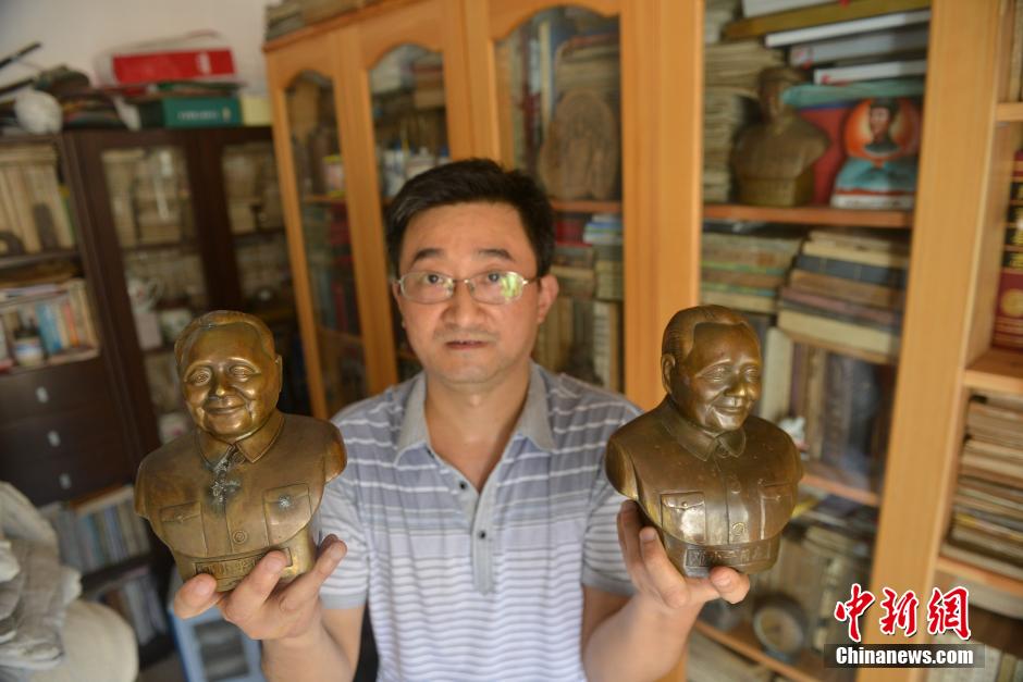 8月20日,四川廣安收藏家范明展示他收藏到的鄧小平雕像。范明在幾十年的生活中隨時保持著收藏習慣,鄧小平紀念章、鄧小平紀念郵票、鄧小平雕塑、鄧小平文選等悉數被范明收藏。作為鄧小平家鄉廣安人,范明在收集鄧小平題材方面的藏品有著得天獨厚的優勢,如今家里各種各樣的藏品已達上萬件。張浪 攝