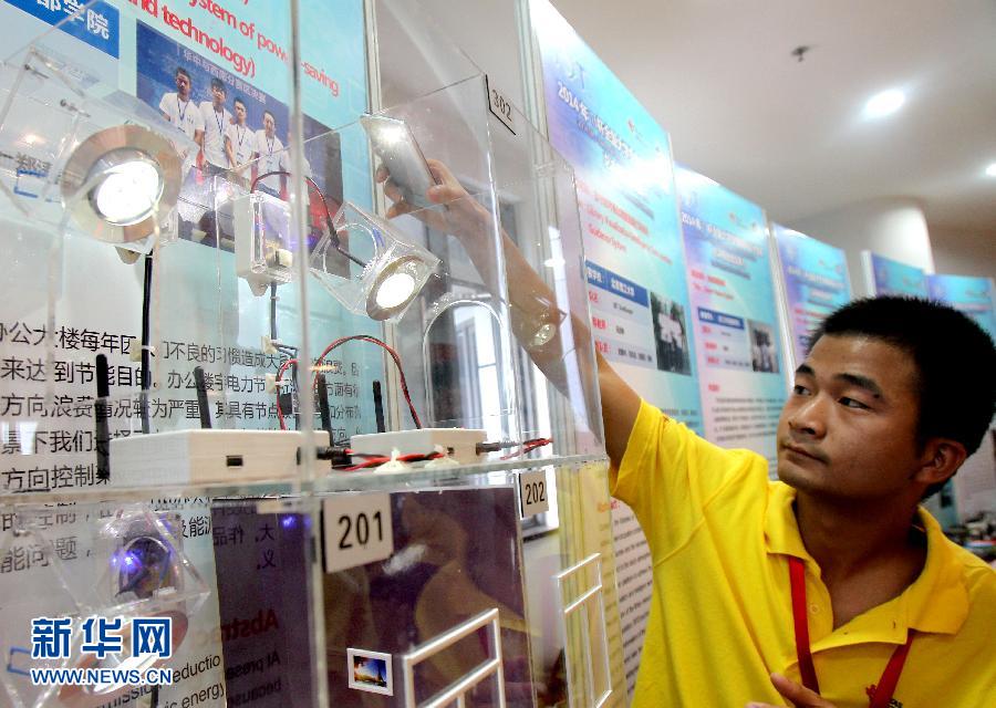 8月27日,電子科技大學(xué)的學(xué)生在展示辦公樓宇節(jié)能燈光智能管理系統(tǒng)。當(dāng)日,“2014年全國大學(xué)生物聯(lián)網(wǎng)設(shè)計(jì)競賽全國總決賽”在上海交通大學(xué)舉行。來自全國200多所高校的500余支參賽隊(duì)伍中精選的50支代表隊(duì)亮相決賽。新華社記者劉穎攝