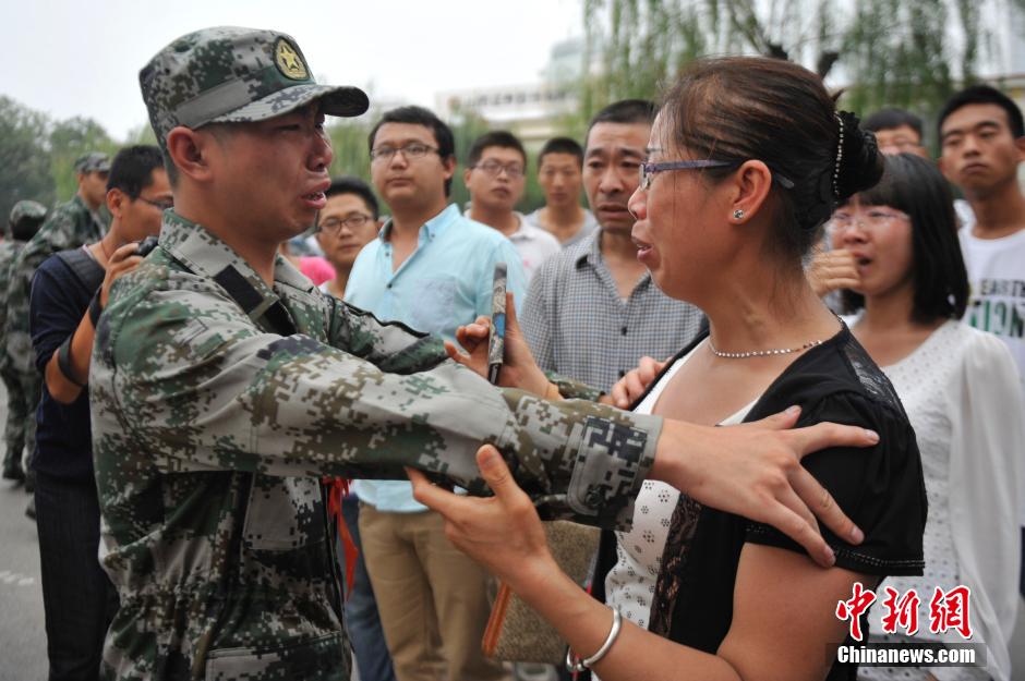 9月10日,山西太原,一名“90后”新兵依依不舍的告別親人,準(zhǔn)備開赴軍營(yíng)。中新社發(fā) 韋亮 攝