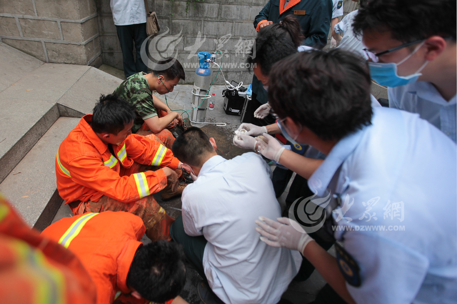 2015年6月2日中午11點半左右,濟南黑虎泉景區(qū)泉水浴場南側(cè)的防空工程內(nèi)突發(fā)事故,正在防空洞內(nèi)施工的2名工作人員從洞內(nèi)爬出呼救,到13時08分,被困在洞中的唯一一名工人被救出。由于防空洞內(nèi)濕滑切油漆味較重,已經(jīng)有救援的消防官兵出現(xiàn)缺氧、暈厥狀態(tài)。圖為救援現(xiàn)場,幾名消防官兵出現(xiàn)缺氧狀態(tài)。大眾網(wǎng)記者 王長坤 攝