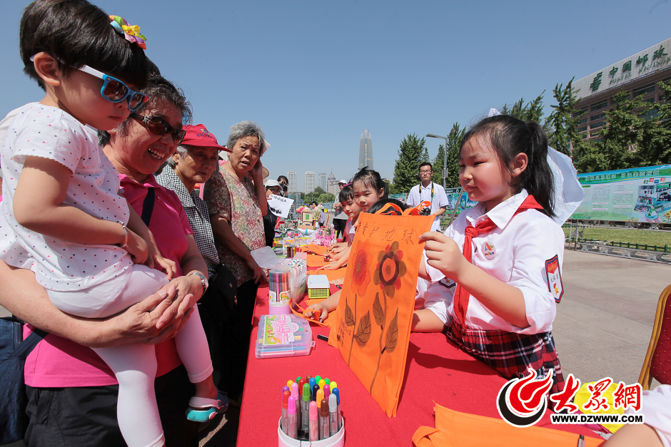 6月5日,濟南泉城廣場,來自龍奧小學二年級的學生現(xiàn)場作畫,向市民宣傳環(huán)保。當日,山東省暨濟南市2015年世界環(huán)境日宣傳活動在濟南泉城廣場舉行。大眾網(wǎng)記者 王長坤 攝
