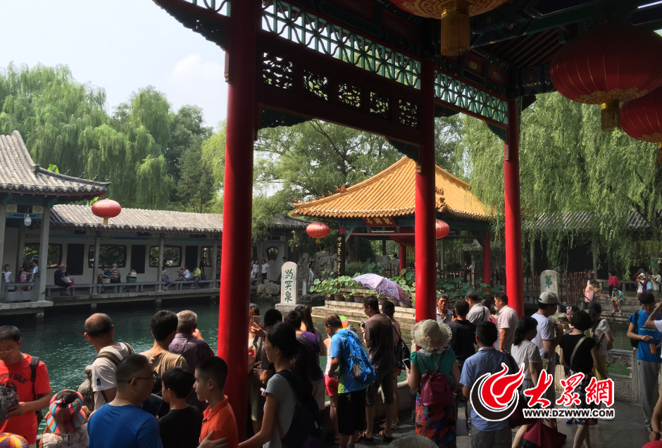 8月10日,在趵突泉畔、濼源堂前,不少游客排隊(duì)等著拍照。當(dāng)日,趵突泉水位漲至28.00米,達(dá)到了28.00米橙色警戒線(xiàn)水位。大眾網(wǎng)記者 王長(zhǎng)坤 攝