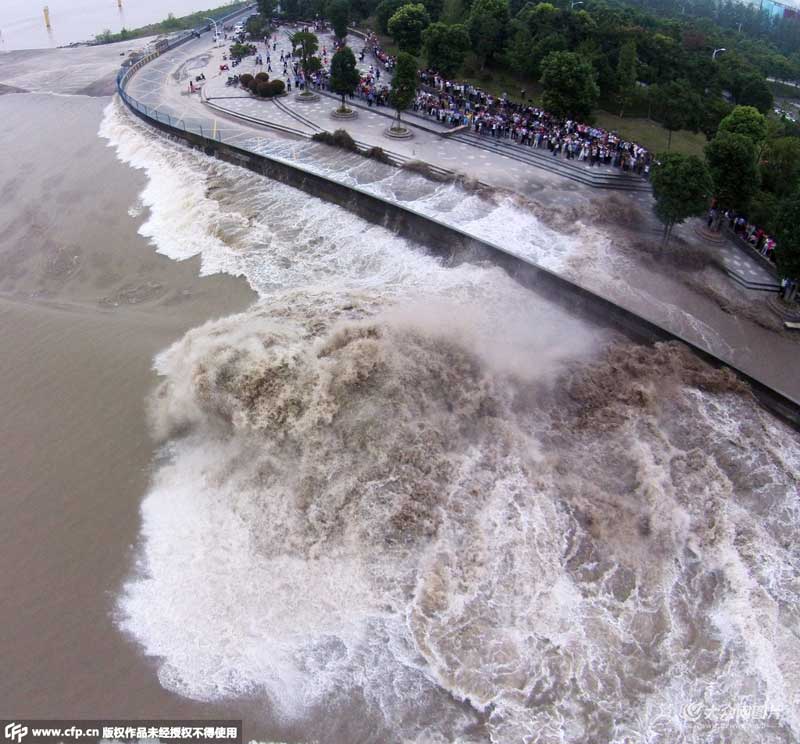 2015年9月28日,杭州,受超強臺風“杜鵑”影響,錢塘江迎來天文大潮期。 錢江潮水勢涌向下沙七格堤壩。