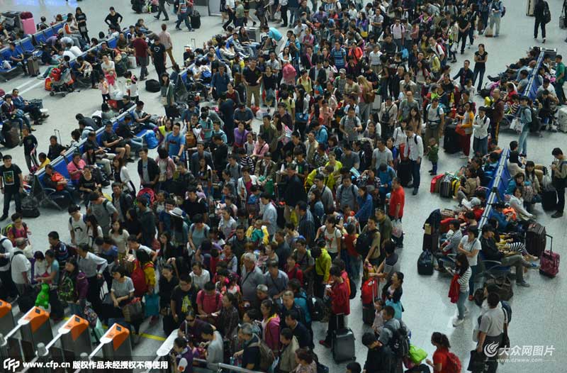 2015年10月7日,杭州,旅客走出杭州火車站,當日是國慶黃金周最后一天,全國鐵路迎來國慶黃金周返程最高峰。