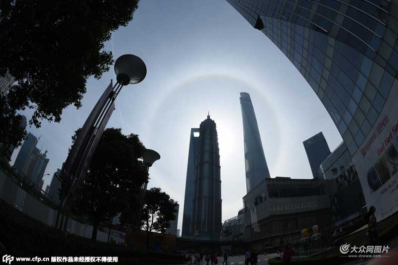 2015年10月10日,上海,一個巨大日暈現高樓大廈上空,至中午仍未消失,景象十分美麗壯觀。