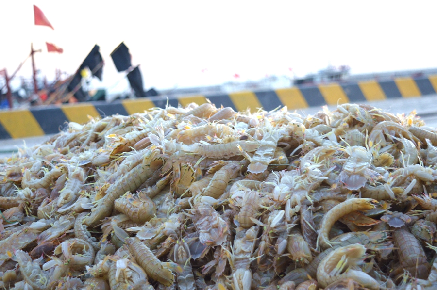 12日下午,新鮮的爬蝦堆滿了碼頭。(記者 王宗陽 攝)