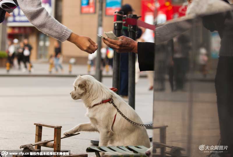2015年10月11日,吉林長(zhǎng)春街頭,一位八旬老人帶著狗乞討,老人稱這只狗不僅會(huì)打鑼,而且會(huì)十以內(nèi)的“加減乘除”,等于幾就打幾下鑼。市民見(jiàn)狗狗聰明,紛紛慷慨解囊,一日下來(lái),幾百元入賬。