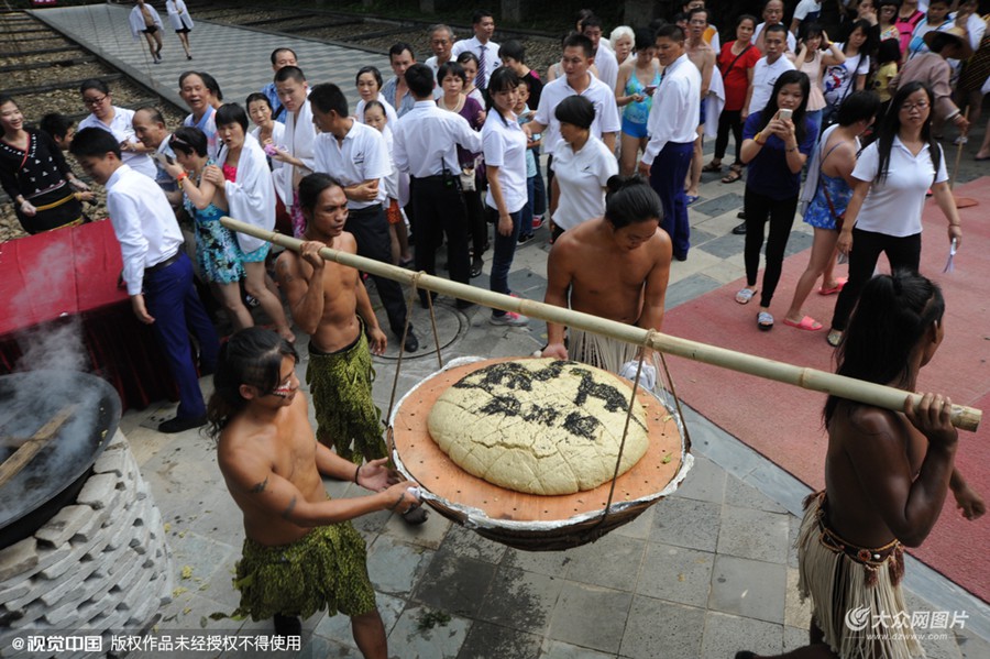 2015年11月8日,廣東清遠,佛岡森波拉景區,一個重達200多斤的青蒿原料做成的“青蒿大包”剛抬出廚房,就被上百名游客分吃一空。
