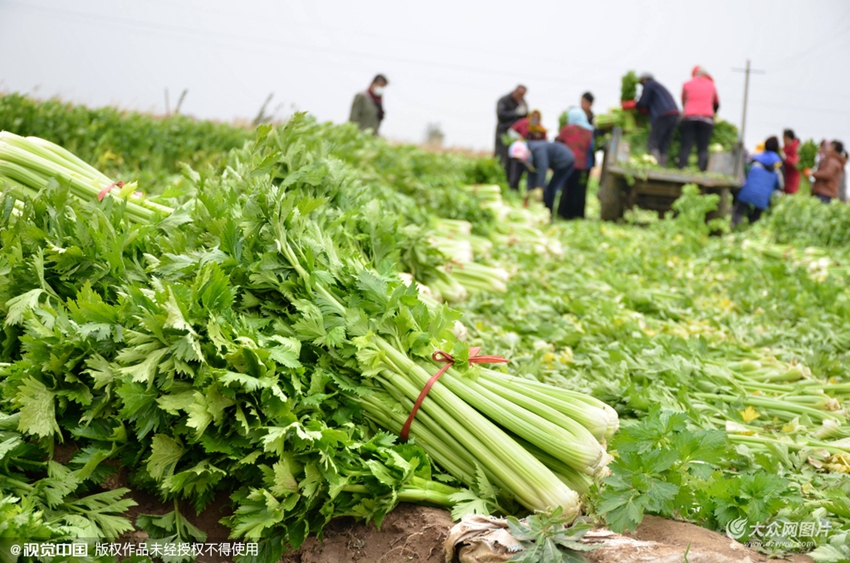 2015年11月5日,山東濱州,陽信縣商店鎮(zhèn)菜農在收割芹菜。今年,素有“西芹種植之鄉(xiāng)”美譽的的山東省濱州市陽信縣商店鎮(zhèn)芹菜豐收卻大量滯銷,芹菜價格更是從2013年的1.3元/斤降到如今的1毛5一斤,即便如此仍無人問津,菜農一畝地要賠兩三千元。在當?shù)孛襟w的報道關注下,不少愛心企業(yè)紛紛開啟芹菜收購,助農解憂。