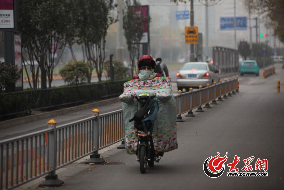 11月10日,濟(jì)南濼源大街,市民在霧霾中騎行。當(dāng)日,濟(jì)南迎來(lái)大霧天氣,整座城市被霧霾籠罩,空氣相對(duì)濕度大于90%,能見(jiàn)度較低;不止是濟(jì)南,今天山東全省都遭遇了霧霾天氣。大眾網(wǎng)記者 王長(zhǎng)坤 攝