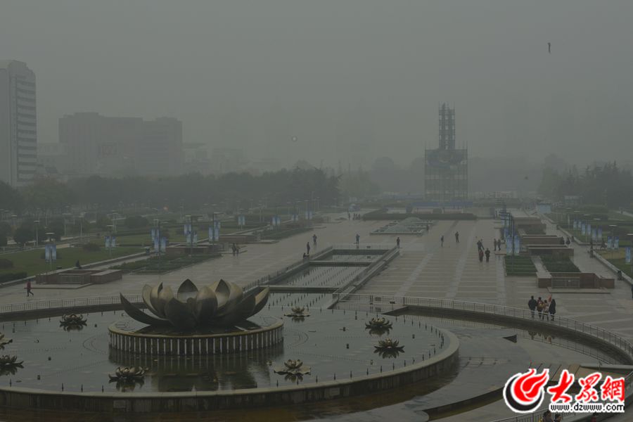 自2015年11月11日起未來3天濟南將持續出現重度污染天氣,濟南啟動重污染天氣III級響應。9點40分,泉城廣場籠罩在霧霾中。(見習記者 孫博洋 攝)