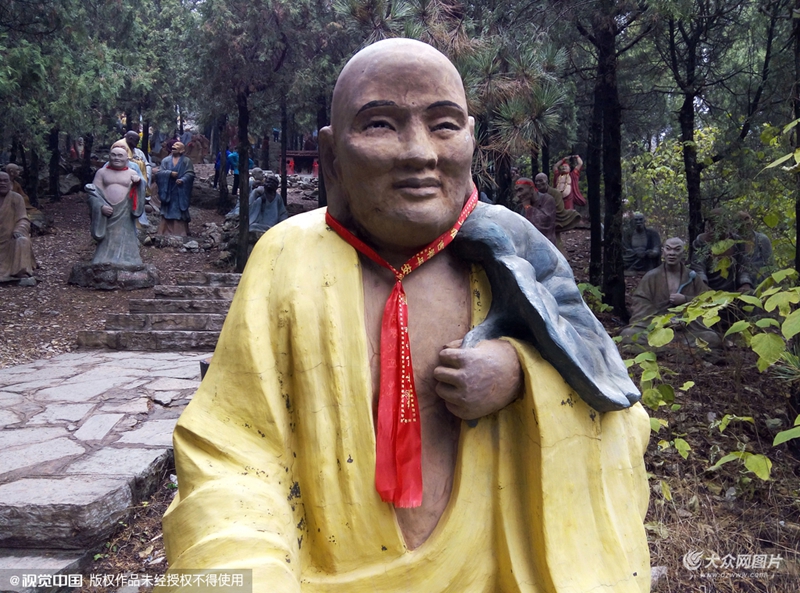 2015年11月15日,山東日照,莒縣浮來山風景區內幾十個羅漢雕塑被游客系上祈福紅布條。