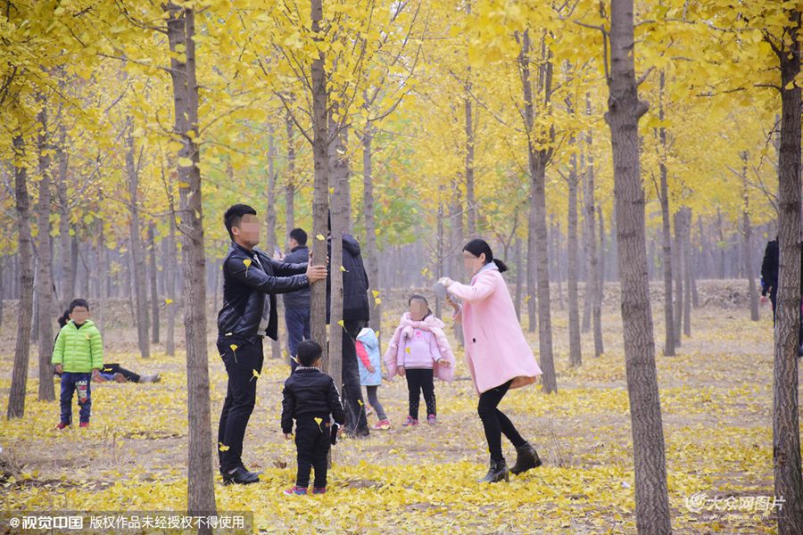 2015年11月15日,山東省濟南市,初冬時節,黃河濟南段千畝生態銀杏林“盡戴黃金甲”,吸引大批游客觀賞拍照。在游覽中,也有部分游客為了拍照,搖晃銀杏樹、腳踹樹干,不文明行為時有發生。
