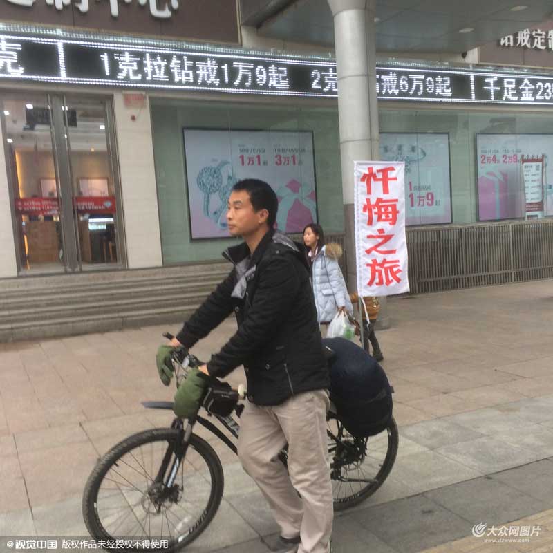 “大家要敬畏法律,與人為善。”昨日上午,在二七廣場(chǎng),一名身穿黑衣的中年男子講述著自己的故事,與圍觀市民交談著。男子身旁停著一輛山地自行車,自行車的車把上固定著一雙軍綠色棉手套。車后座上綁著一個(gè)帆布包袱,車身上插著一面旗子。白色的旗子上寫(xiě)著四個(gè)大紅字“懺悔之旅”。不少好奇的市民詢問(wèn)旗子上四個(gè)字是什么意思。男子向大家講述了自己的經(jīng)歷。