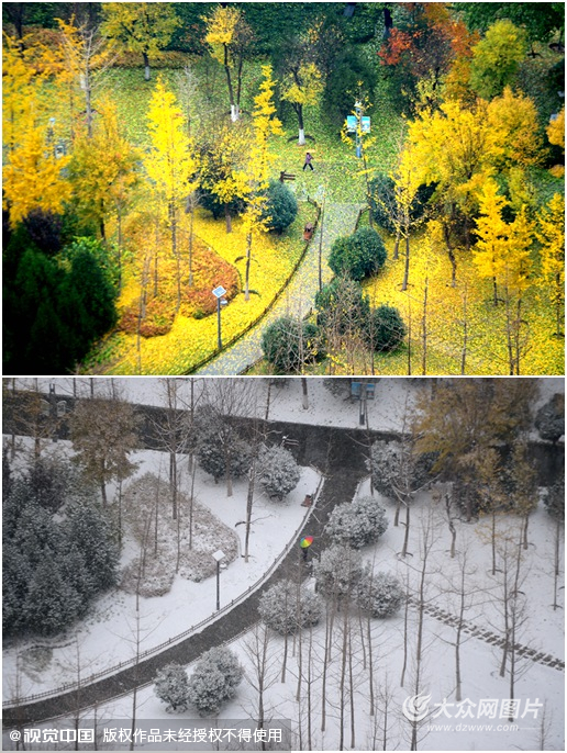 2015年11月22日,山東省濟南市冬雨之后的西郊森林公園里遍地都是銀杏葉,如同滿園都是黃金甲,然而三天后的25日,第一場冬雪的到來,讓這里變成了“林海雪原”。