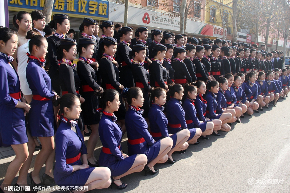 2015年12月4日,山東濱州,參加藝考的高三女生身著空姐制服拍合照。當日,山東省濱州市一家藝考培訓學校的百余名高三女生不畏嚴寒,冒著零下四度的低溫裸露大腿拍攝空乘制服合照,不少過路司機索性停車拍照圍觀,只為一睹壯觀美腿陣容。