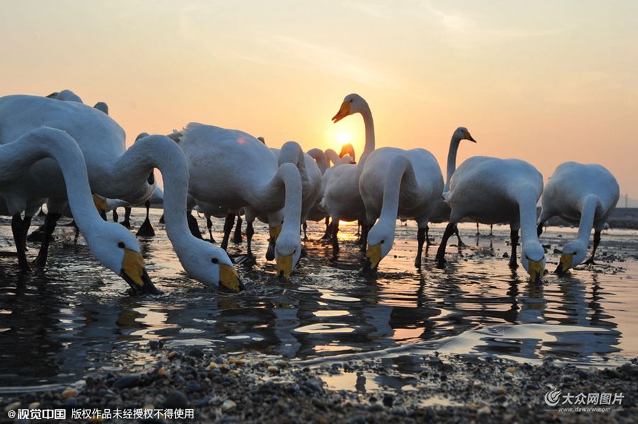 2015年12月08日,山東省榮成市,數(shù)量眾多的大天鵝在馬道鎮(zhèn)煙墩角村一處瀕海港灣棲息覓食。