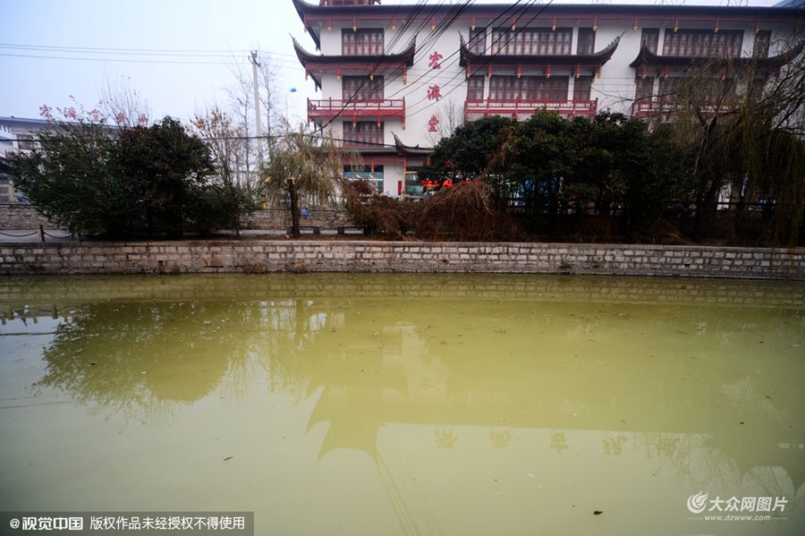 2015年12月10日,山東省濟(jì)南市,在東工商河藥王樓附近,西岸河堤處有一排水口,大量褐色的污水排入河中,河水由原來的碧綠色變成了米黃色,走進(jìn)河岸時(shí)可以聞到刺鼻的臭味。