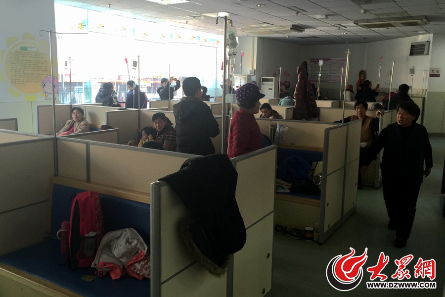 2016年1月12日,濟南的最低溫降到了-8℃。上午,婦幼保健院注射室里人滿為患,家長帶孩子打針時也要用衣服來占座。(記者 孫博洋 攝)