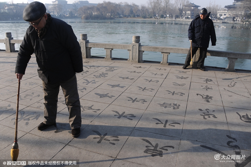 2016年1月19日,濟(jì)南大明湖景區(qū)新景區(qū),大爺在零下13度左右的天氣里,用毛筆在地面寫滿“冷”字。