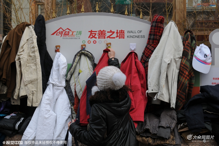 2016年1月31日,山東青島,獻愛心活動得到市民的積極響應,紛紛從家中將洗好的閑置衣物懸掛到嘉定路的“愛心墻”上供需要的人領取。