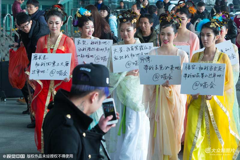 2月5日下午,杭州火車東站香艷撲面,一群打扮夸張妖嬈嫵媚的“蜘蛛精”漫步春運客潮中。“大圣,娶我回花果山!”“師傅,帶我見如來!”美女們手持雷人標語,引發旅客圍觀,更有年輕人把持不住,拖著行李上前求合影。