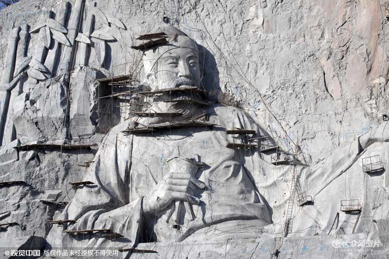 2016年2月6日,湖北省襄陽市,在一處廢棄采石場上雕刻的孟浩然和其經(jīng)典五言古詩《春曉》將環(huán)境保護與文化藝術很好的結(jié)合起來。