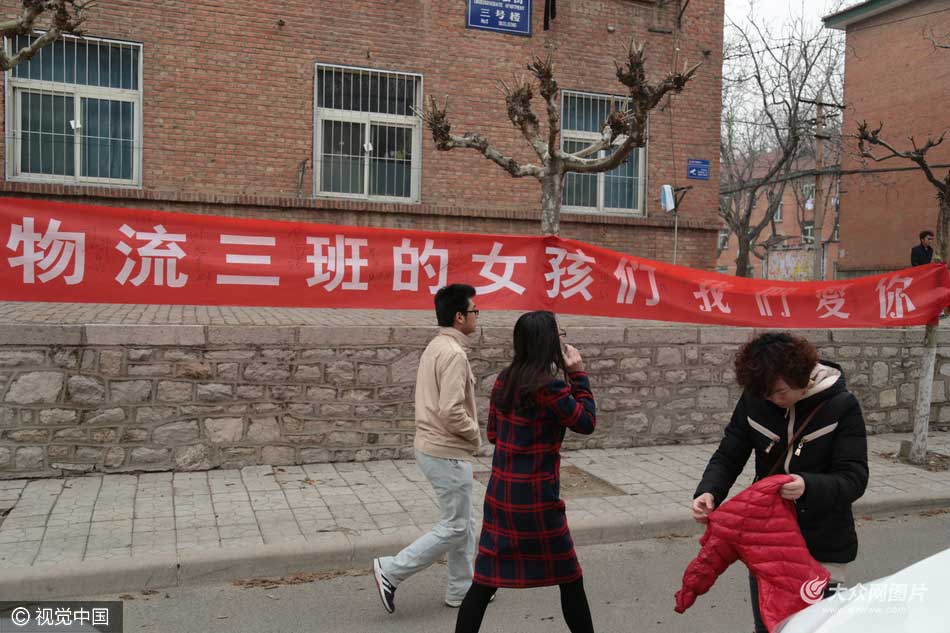 2016年3月7日,山東濟南某高校內為慶!叭恕眹H婦女節,在校園內懸掛多條條幅來慶祝這一節日來到。