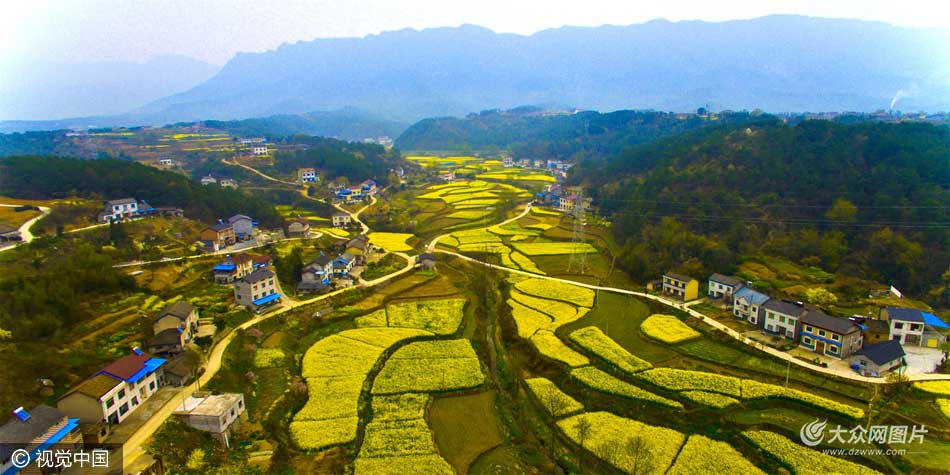 2016年3月15日,湖北省宜昌市。春暖花開時節(jié),湖北省宜昌市夷陵區(qū)分鄉(xiāng)鎮(zhèn)“花田農(nóng)居”耕植的萬畝油菜花競相綻放,一幅農(nóng)耕圖景點綴其中,航拍下的“美麗鄉(xiāng)村”風景猶如一幅神奇又壯觀的田園詩畫,美不勝收。