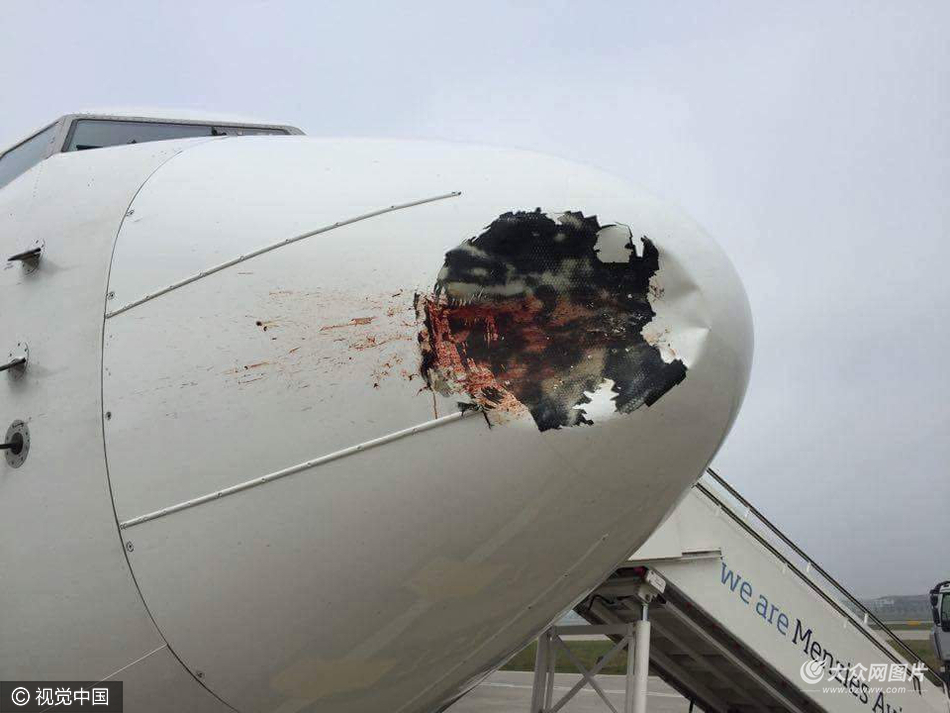 據(jù)澳大利亞新聞網(wǎng)站報道,埃及航空公司一家從開羅起飛的波音737-800飛機在周五下午4點左右(北京時間周六零時)安全到達倫敦西斯羅機場后,被一只鳥猛烈撞擊。飛機前部被嚴重破壞,撞出了一個大洞,上面沾有血跡和鳥的羽毛。
