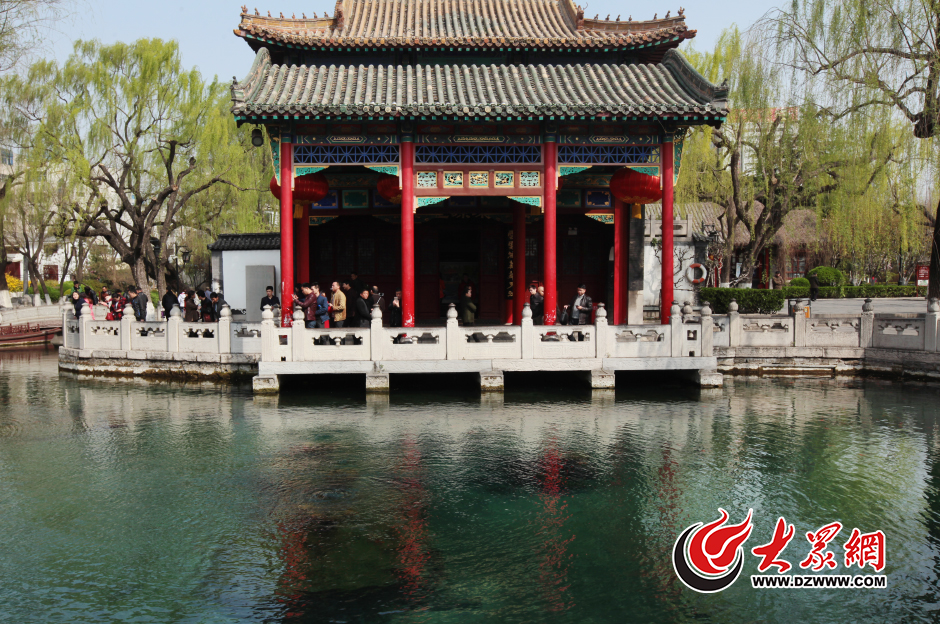 3月23日,游客在濟南趵突泉畔賞泉拍照。當日,濟南趵突泉實時水位降至27.52米,跌破27.60米的紅色警戒線,面臨停噴危險。大眾網(wǎng)記者 王長坤 攝