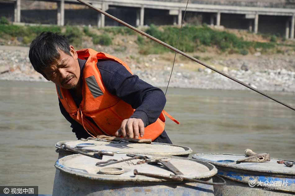 2016年4月12日,四川攀枝花,鐘世鋒在制作浮桶,為發(fā)電做準(zhǔn)備。