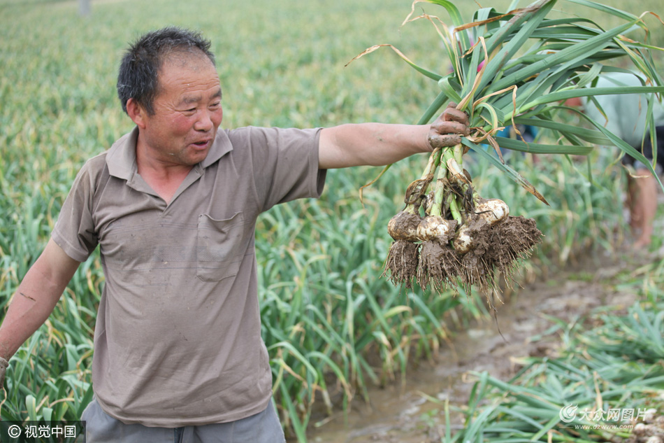 2016年5月9日,在山東省臨沂市平邑縣溫水鎮(zhèn)梭莊村,村民在忙碌著收獲新蒜。