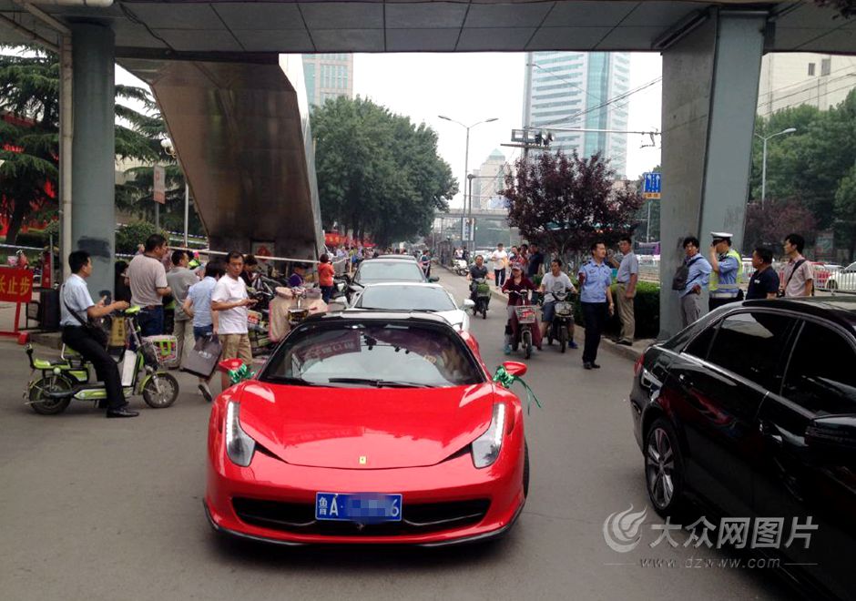 6月7日下午,山東省實驗中學考點外,4輛貼有“愛心送考車”標志的豪車一字排開,其中包括法拉利、蘭博基尼、賓利等,氣勢十足。