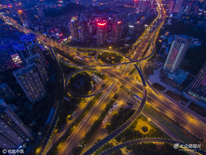 6月15日,山東省濟南市,航拍夜色中燕山立交橋,5層橋體層層疊疊,車輛交織、燈火輝映,宛如巨大琴弦,開啟視覺盛宴。