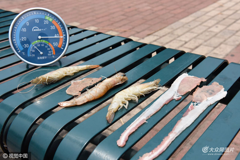 6月21日,在山東濟南省體育中心附近有人在涼椅上烤肉,烤大蝦,而此時椅子上的溫度已經達到了40攝氏度,不一會的功夫,大蝦表面已經微微發紅,而烤肉已經被烤得發干發硬。