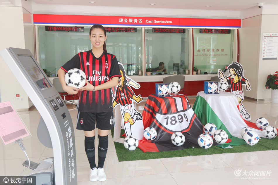 2016年7月11日,山東省濱州市,一家銀行營業大廳里擺滿足球,室內掛滿意大利足球豪門俱樂部AC米蘭的各個時代的球星大幅照片,仿佛置身AC米蘭的榮譽室,而銀行員工們身著米蘭球衣上班的場面也令前來辦業務的客戶驚奇不已。