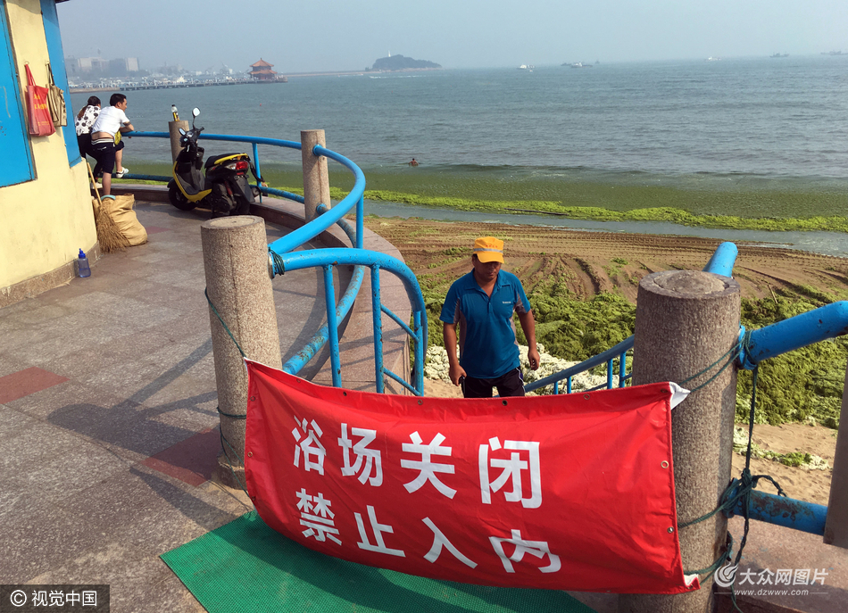 2016年7月22日,青島棧橋海水浴場(chǎng)整個(gè)沙灘鋪滿滸苔,滸苔中摻雜整個(gè)各種垃圾雜物,浴場(chǎng)宣布暫時(shí)封閉。相關(guān)部門動(dòng)用推土機(jī)進(jìn)入浴場(chǎng)沙灘,清理堆積的滸苔。