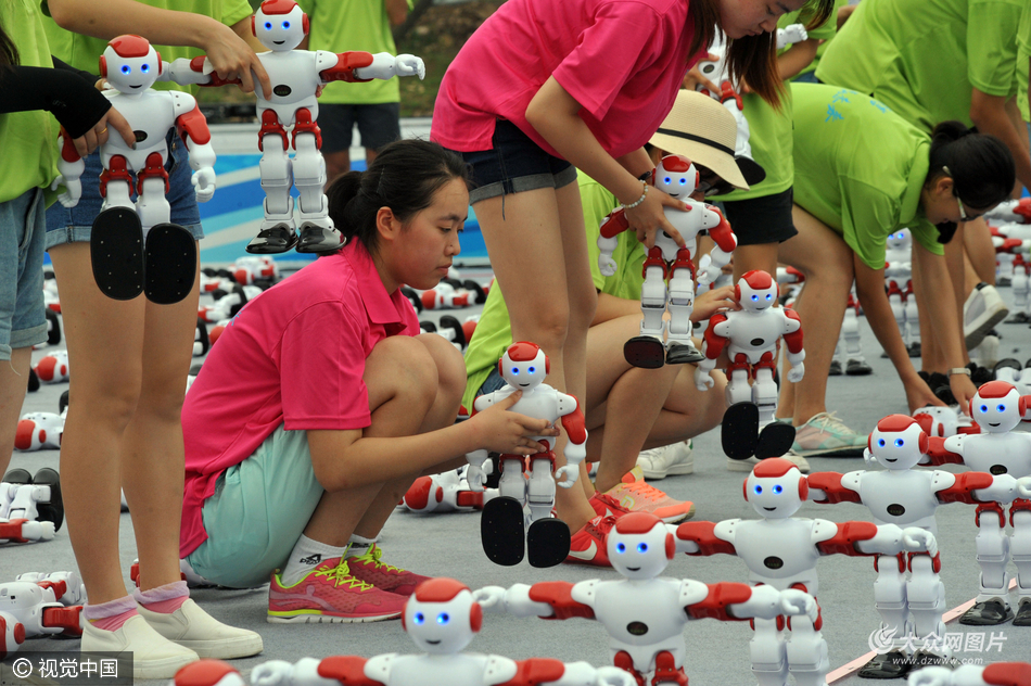 2016年7月30日,青島。青島啤酒節(jié)會(huì)場,挑戰(zhàn)機(jī)器人同時(shí)跳舞的吉尼斯世界記錄成功,同時(shí)有1007個(gè)機(jī)器人同時(shí)跳舞,見證官現(xiàn)場頒發(fā)證書。