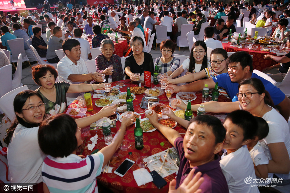 2016年8月20日晚上,山東東營(yíng),市民在“百家宴”上吃飯聊天,加深鄰里親情。當(dāng)天,東營(yíng)市東營(yíng)區(qū)勝利街道中山社區(qū)的430余戶共600余市民,每人端來(lái)一盤(pán)拿手好菜,在華都世紀(jì)城小區(qū)廣場(chǎng)擺出50桌宴席。他們圍坐在一起,品各色美食,話家長(zhǎng)里短,看精彩演出,現(xiàn)場(chǎng)其樂(lè)融融;50張圓桌整齊地?cái)[放在廣場(chǎng)上,現(xiàn)場(chǎng)你來(lái)我往,場(chǎng)面十分壯觀。